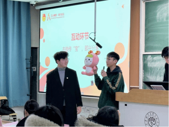 会议第四项议程是互动环节——击鼓传“宝”。学生会主席团成员带领大家互动游戏,当音乐响起,共青团吉祥物“团宝”开始传递,收到“宝”的同学需要通过抽签来分享自己对学院学生工作的意见和看法,学院学生会借此机会聆听大家的真实想法和建议,大家在欢笑中建言献策、凝心聚力,收获前进的动力。